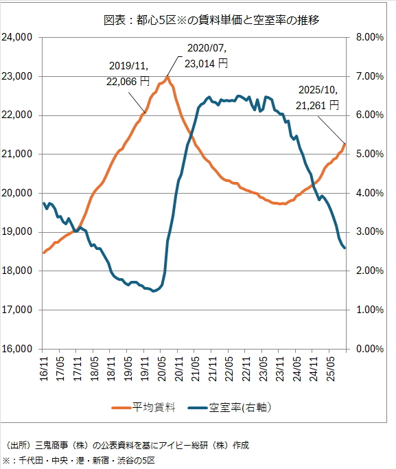 オフィスビル賃貸市場は、コロナショックの影響を払拭し急速に回復している。しかし図表の通り、2025年10月時点では、東証REIT指数が高値を付けた2019年当時の水準まで達していない。直近1年の賃料単価上昇率は5%となっており、この上昇率が続けば1年後に2019年11月時点の賃料単価まで上昇することになる。言い換えれば2026年3月末時点では、オフィスビル賃貸市場は高値を更新するようにはなっていない可能性が高い。