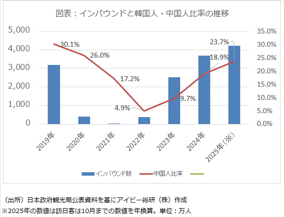 インバウンドは10月までの実績値を年換算すると、前年比14%増で図表の通り初めて4,000万人を超える勢いで増加していた。特に中国人の比率は23%を超え最大となっているため、大幅な減少となれば影響は大きい。