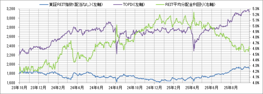 <東証REIT指数と予想分配金利回りの推移> (グラフは2023年10月~2025年9月の24ヶ月間)